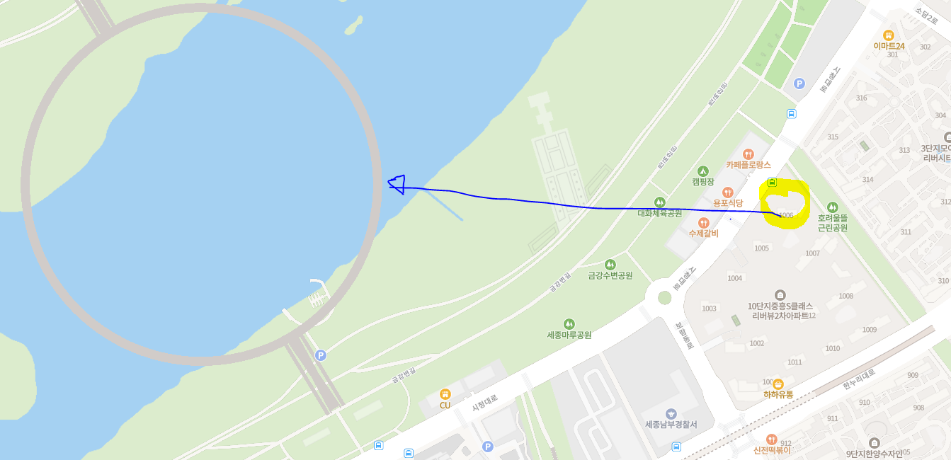해당 아파트가 비싼 이유는 세종에 몇 없는 큰평수의 호수뷰이기 때문이다. 해당 건물의 앞에 8층짜리정도 되는 상가들이 있는데, 살짝 걸려보여서 테스트를 해보았다. 8층과 9층 사이에서 같은 방향의 계단에서 바라보았을 때 8층보다 약간 위에 있음에도 불구하고 원형교는 보이지 않았다. 주로 행사를 하면 원형교에서 하기 때문에 그 뷰가 굉장히 예쁘다고 들었지만, 아쉽게 하늘의 폭죽만 가까이서 볼 수 있는 느낌이었다.