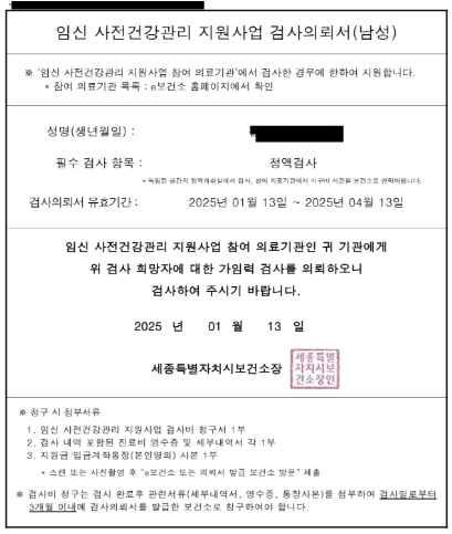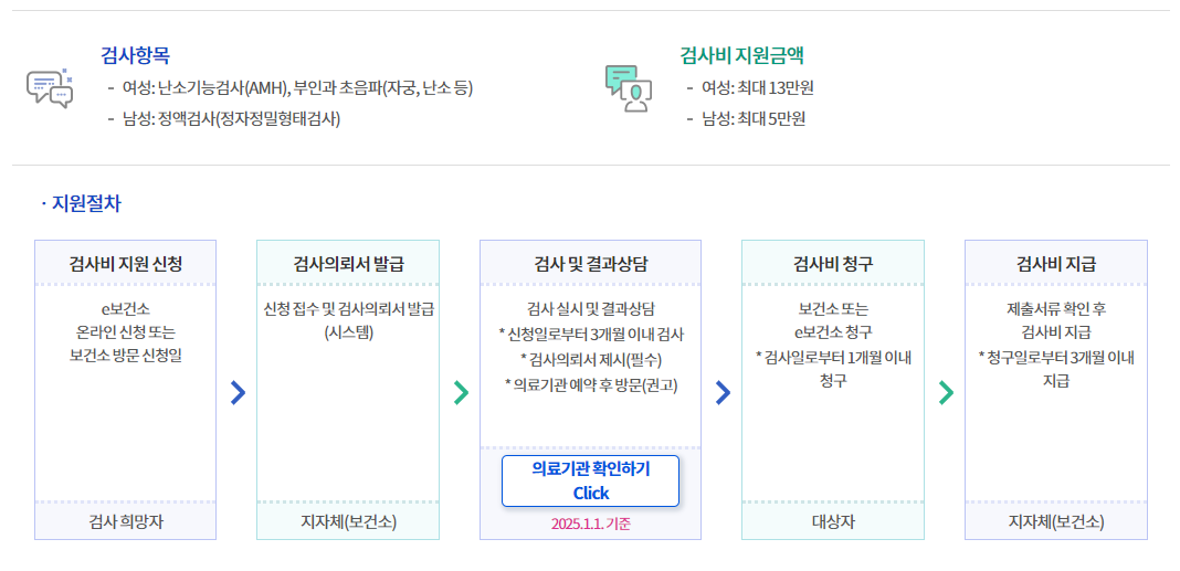 남자 : 정액검사(최대 5만원) /  여자 : 난소기능검사, 부인과 초음파 진행(최대 13만원)