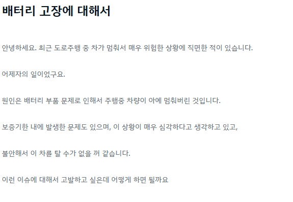 원인은 배터리 고장, 차 자체 결함이었다. 보증기간이 아직 남아 공짜로 교체해주었다.