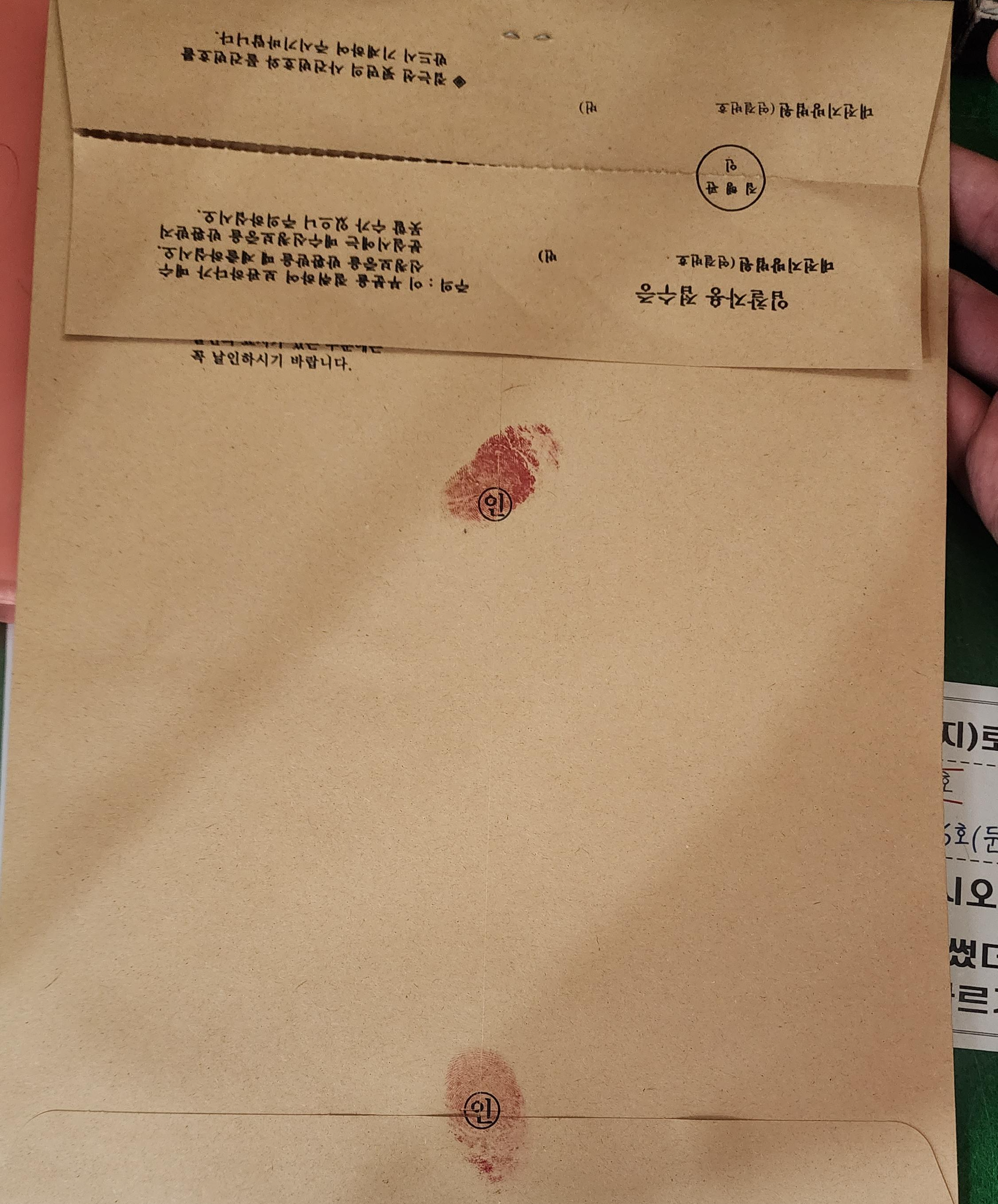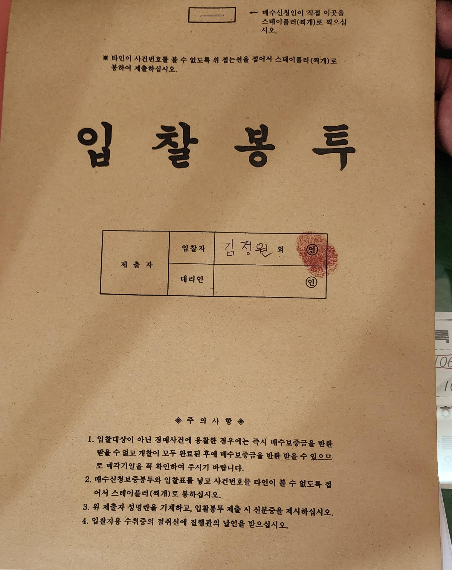 저는 작성해 둔 기일입찰표를 따라서 옮겨 쓴 뒤, '인' 표시가 있는 부분에 모두 지장을 찍었습니다 ㅎㅎ