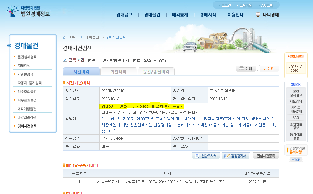인터넷으로 다시 검색해 보니 취소되었다는 내용이 없고, 제가 준비한 그대로 제출했습니다. 후에 집으로 돌아와 아래의 연락처로 문의를 하니, 금일 아침에 채무자가 개인회생 신청하여 개인회생인가 결정까지 매각을 할 수 없게 되었다는 연락을 받아 인터넷에 게시할 수 없었다고 합니다.