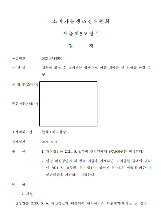 분쟁조정위원회의 결정을 통해 저는 환불을 받을 수 있었습니다. 이 경험을 통해 결혼 준비 과정에서의 작은 권리라도 놓치지 않고 챙길 수 있다는 것을 깨달았습니다. 여러분도 결혼 준비를 하면서 불합리한 상황에 직면하게 된다면, 적절한 절차를 통해 떼인 돈을 돌려받을 수 있으니 참고하시기 바랍니다.